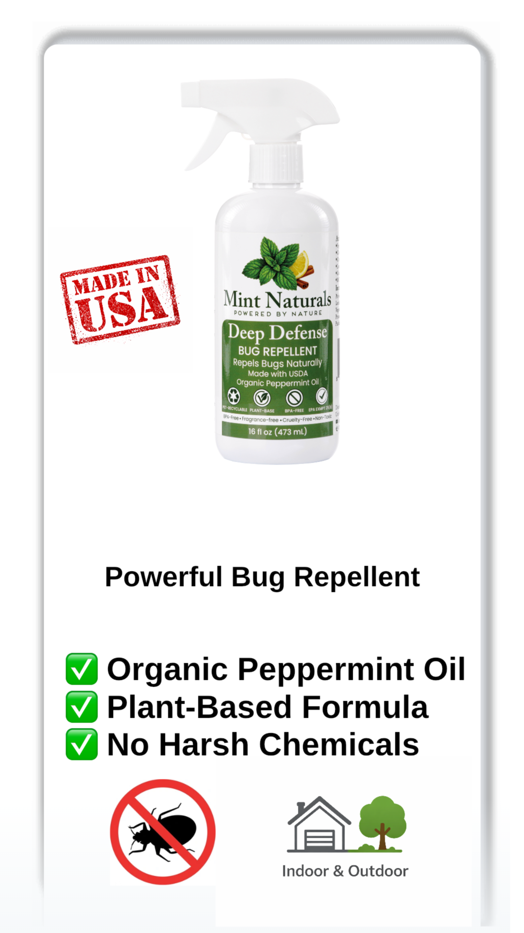 A plant-based bug repellent spray designed for everyday protection. Crafted with USDA peppermint oil, this formula helps repel common insects while remaining fresh, effective, and pleasant to use indoors or outdoors. Made in USA.